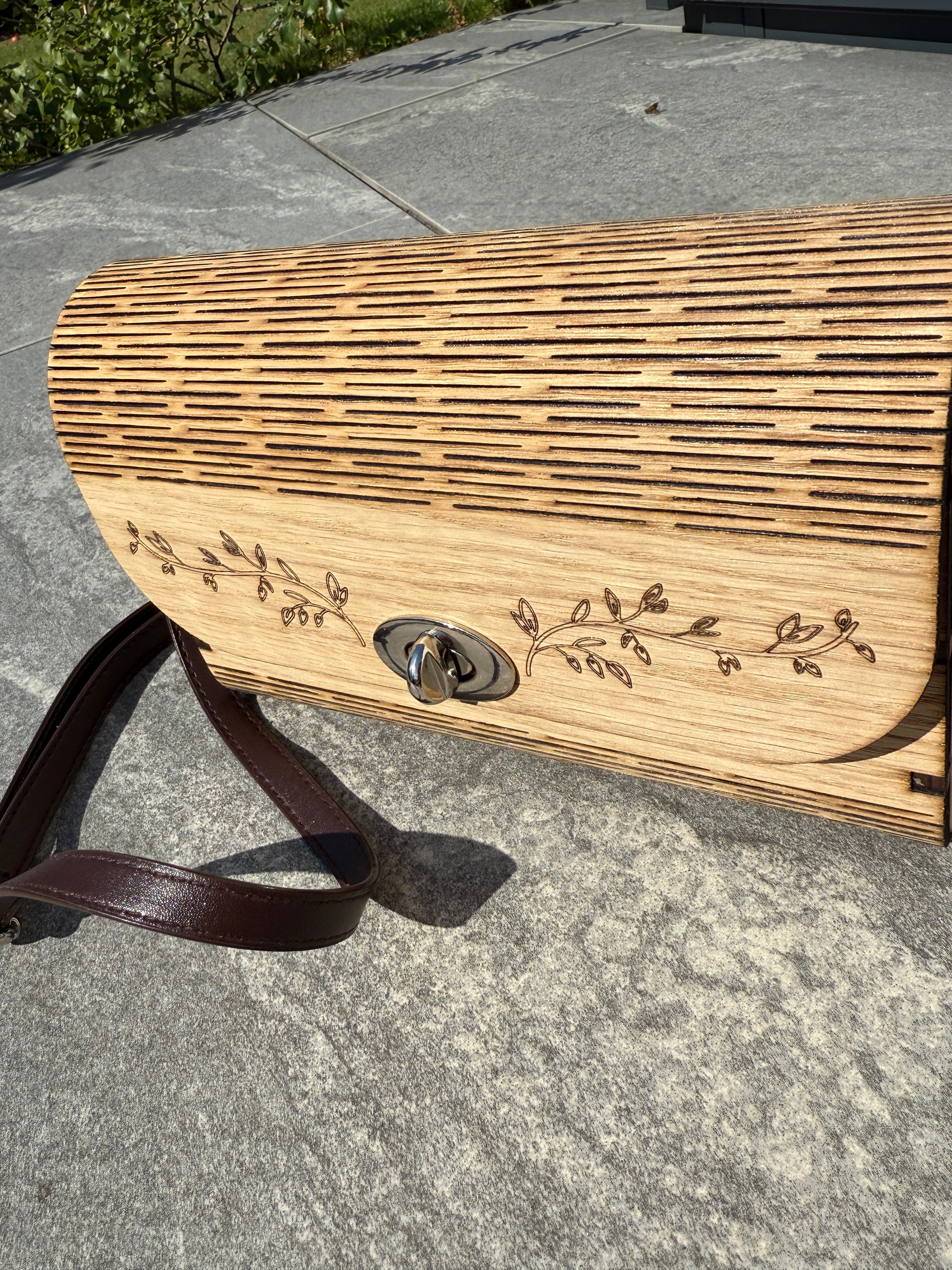 Diese handgefertigte Holztasche vereint edles Design mit einem Hauch Natur. Jede Tasche wird in liebevoller Handarbeit hergestellt und ist damit ein echtes Unikat. Die geschwungene Holzform, feine Gravuren und der moderne Verschluss machen sie zu einem besonderen Holzaccessoire, das sofort ins Auge fällt.